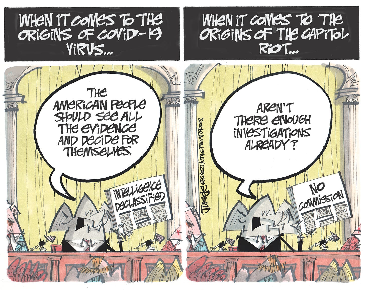 And as the cartoon points out, the “Let the American People See the Evidence and Decide for Themselves” Republicans blocked a commission to examine the causes and repercussions of the Capitol riot.