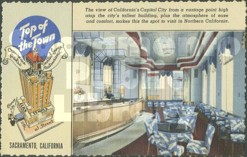 According to the ever-informative internet, “Top of the Town” was on 14th floor of the Elks Temple and had a 360-degree view of downtown Sacramento, which was probably a Big Deal in the late 1940s.