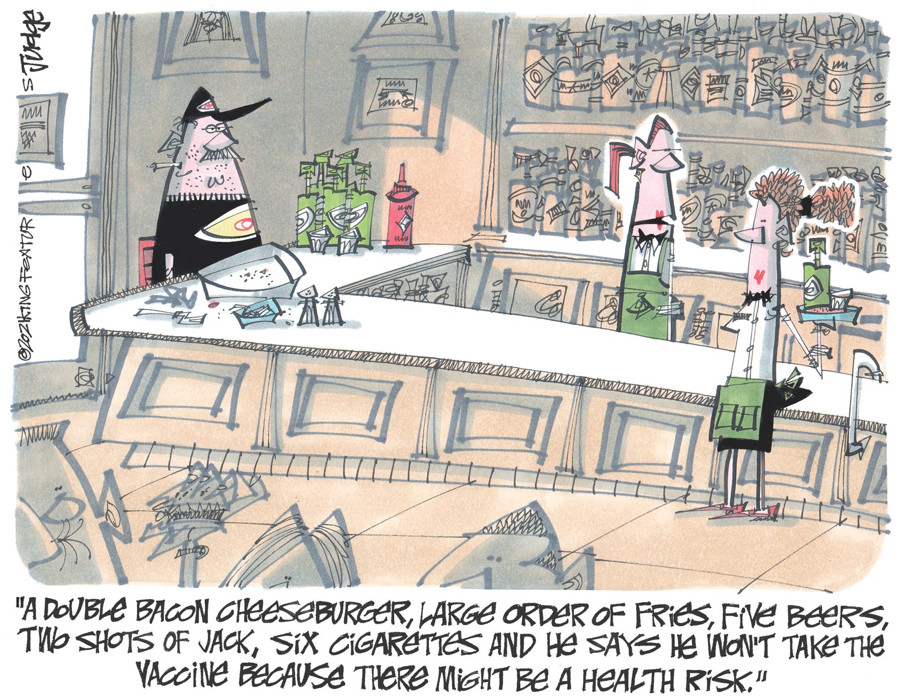 Today’s cartoon wrote itself when I read a story about a guy who wasn’t going to take the COVID-19 vaccine because he was worried about the side effects and the reporter “managed” to slip in (talk about passive-aggressive) the fact that the guy worried about vaccine side effects had stopped at a convenience store to buy cigarettes.