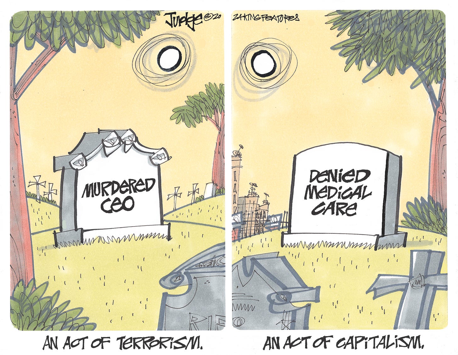 Corporate America sells us guns and then fires as many people as logistically possible (and quite often, a few more than that) and fucks us out of the medical insurance coverage we paid for and then are totally shocked when a CEO gets shot.