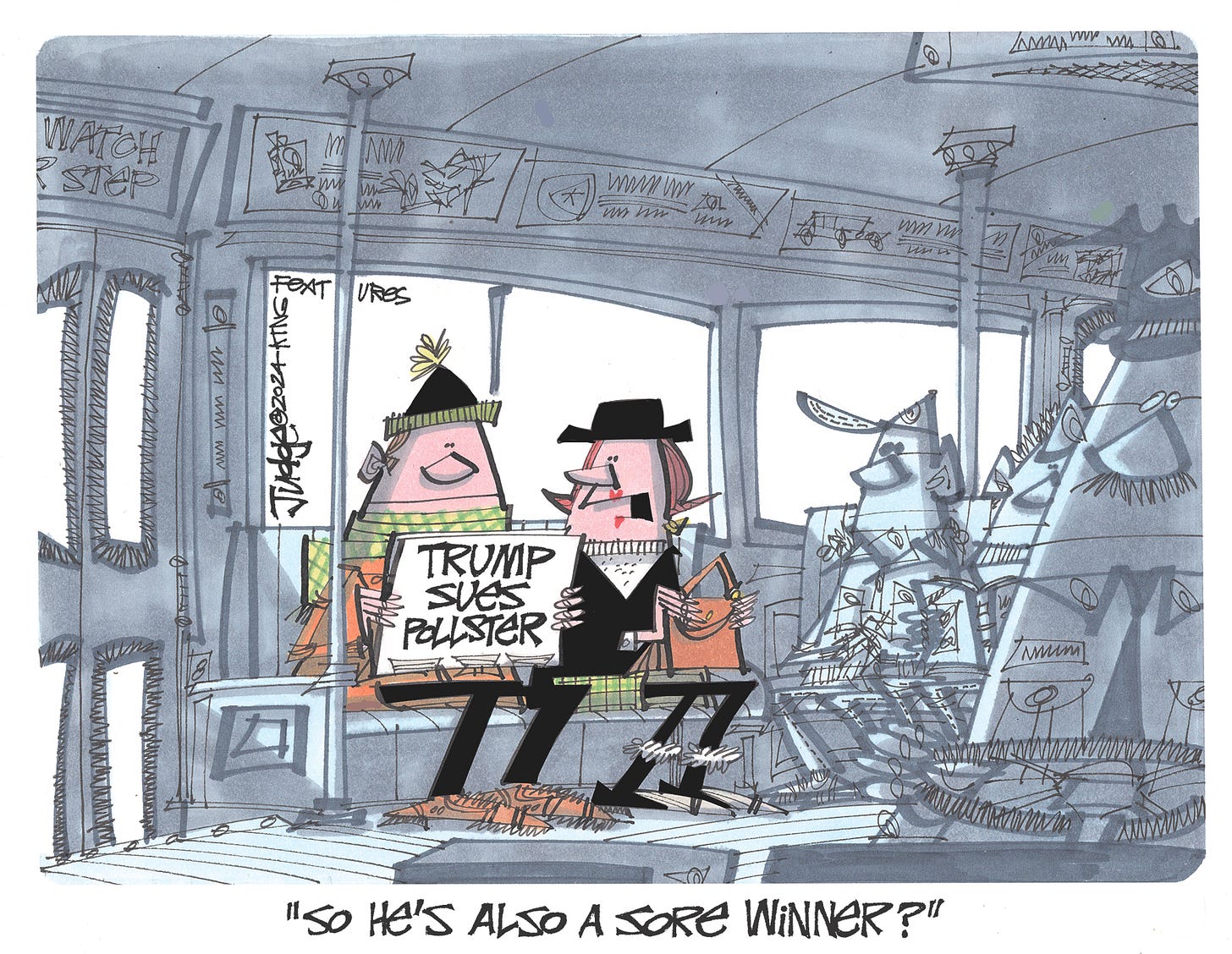 We’re well aware of how Trump behaves when he loses and now we’re seeing how he behaves when he wins and yes, I’m also aware that I used the term “Sore Winners” to describe Chiefs fans who are/were upset that their 13-1 team weren’t winning by a big enough margin, which is probably why I thought of that term after reading about Trump’s pollster lawsuit, but I haven’t used “sore winners” in a cartoon and I have absolutely no compunction about stealing lines from myself.
