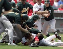 But according to Fred Kendall (Jason’s father who played Big League baseball and then became a coach) the scouting report other teams had on Jason said that even though Kendall’s diving, don’t pitch him inside because he won’t move out of the way and you’re going to hit him and if you’re stupid enough to make some remark about him not moving out of the way, he might come to the mound and kick your ass which is what you see him doing here.