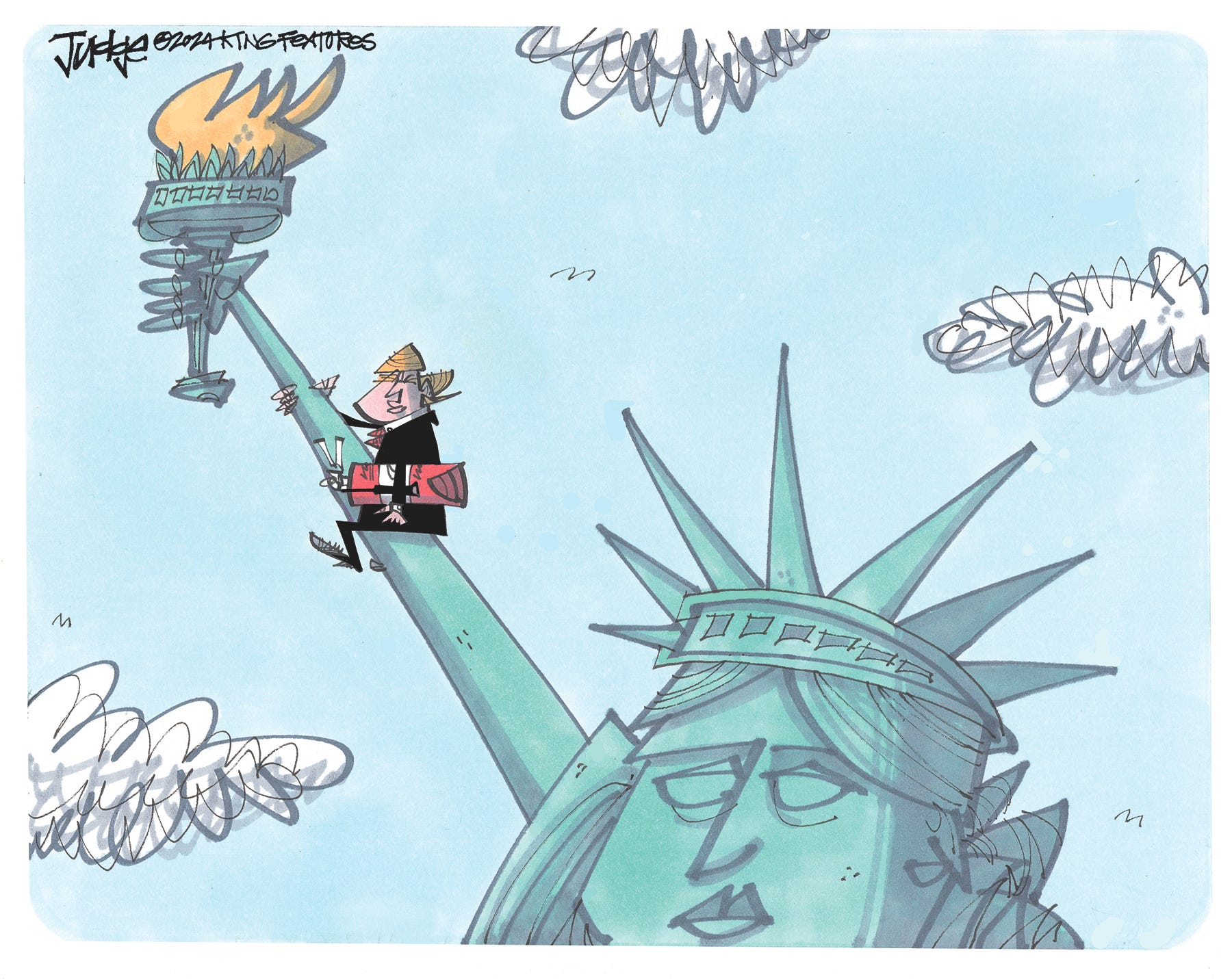 So you can see why Donald Trump is climbing the Statue’s arm carrying a fire extinguisher.