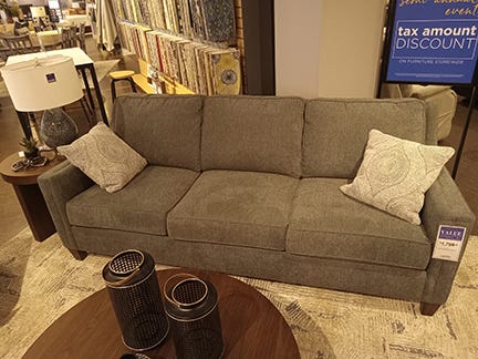 So here’s the couch I bought, but I need to change it to a darker color to hide all the things I plan to spill on it, so I’ve got to wait six-to- eight weeks for a team of Lutherans to assembly it (the Amish were out of my price range) which is a pain in the ass, but it’s a Flexsteel sofa so I clearly picked the right brand and here’s proof: