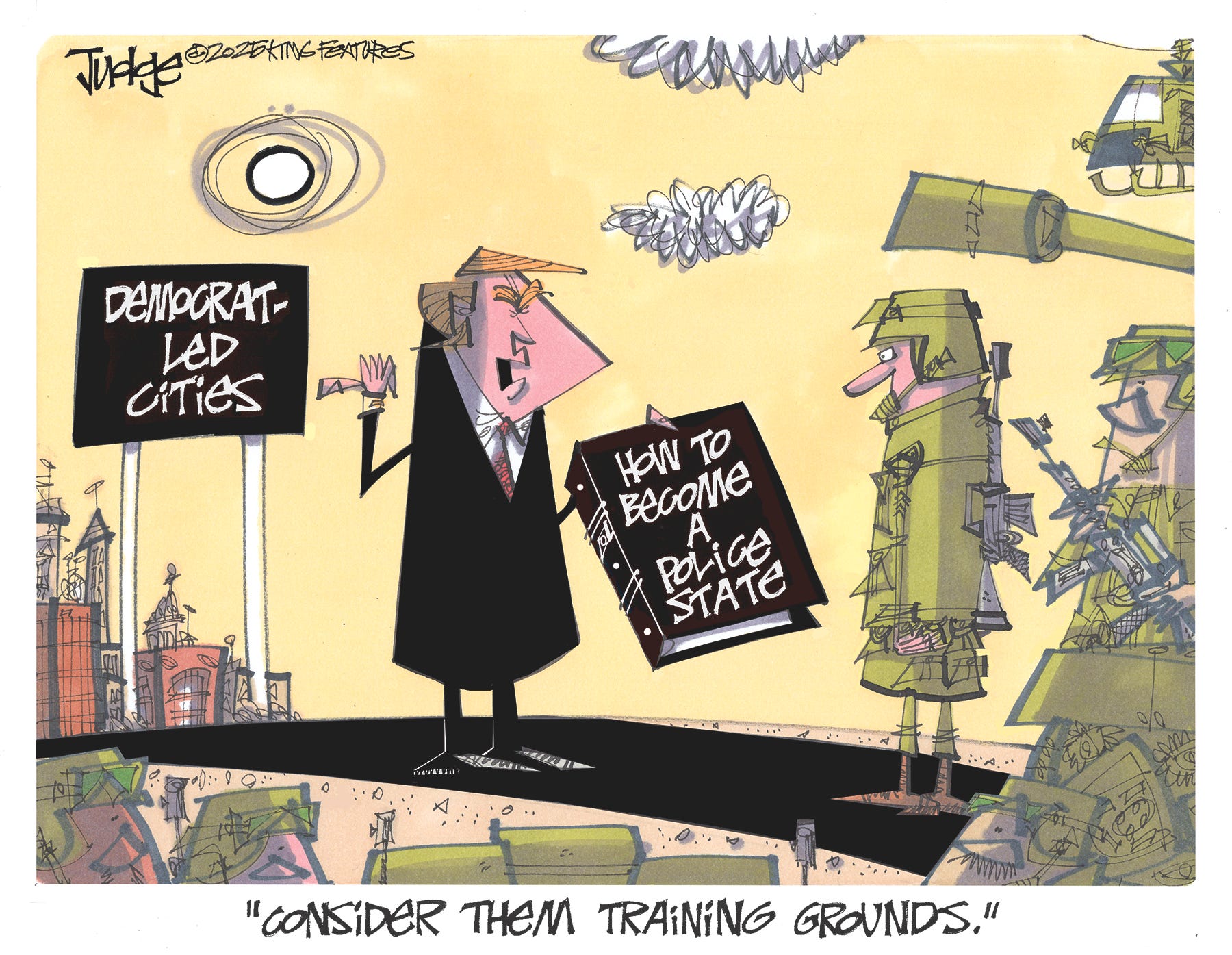 During his recent political rally that Trump forced over 800 military leaders to attend, Trump suggested that the US military could use American cities as “training grounds” which is—and once again let’s go with—“interesting” because the Posse Comitatus Act of 1878 generally prohibits the use of US military on US soil because someone smarter than the people currently in power thought it would be a good idea to keep civilian law enforcement separate from military power.